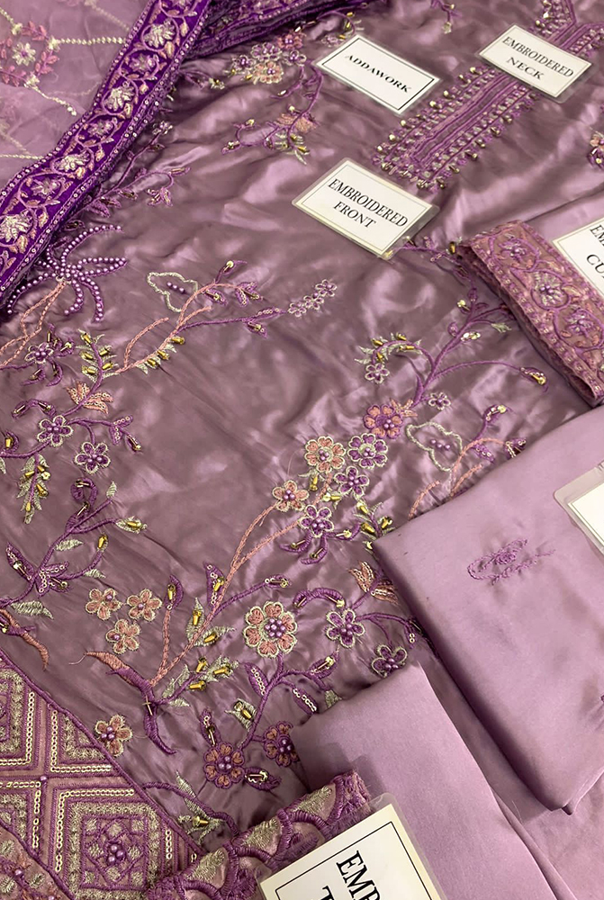 Embroidered Shamoze Silk with Adda Work and Stone Work Trouser: Dyed Shamoze Silk Dupatta: Heavy Embroidered Silk with 4-Side Embroidered Attached Lace`